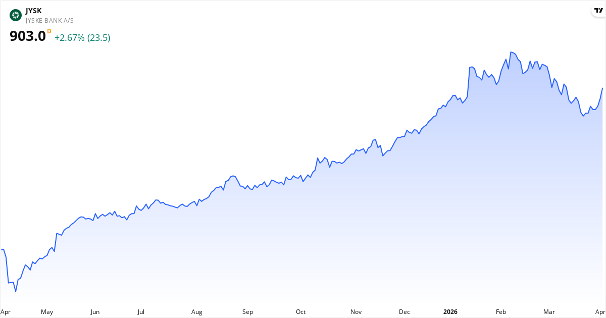 Jyske Bank stiger for tiden. De tekniske indikatorene viser: kursen ligger 5.3% over 20-dagers gjennomsnittet; insidere har overveiende kjøpt aksjen i det siste. Siste nyheter som kan påvirke kursen: Jyske Bank oplyser om gennemførte handler i bankens aktietilbagekøbsprogram, som løber fra 5 februar 2026 til senest ... (30/03, Tilbagekøb af egne aktier); Jyske Bank oplyser om handler i tilbagekøbsprogrammet, der løber fra 5 februar 2026 til senest 29 januar 2027 med en ... (23/03, Tilbagekøb af egne aktier); Generalforsamlingen godkendte 2025 årsrapport og udbytte på 25 kr pr aktie svarende til 1.538 mio kr. Bemyndigelse ti... (17/03, Øvrige ændringer). For den siste konteksten, se vår tekniske analyse, innsider-seksjon og nyhetsoversikt ovenfor.