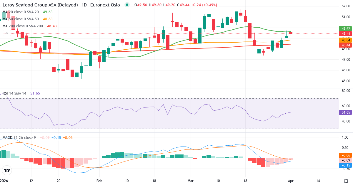 Golden Cross: 50-dagers gjennomsnittet (48.76) ligger over 200-dagers (48.41), hvilket er et klassisk bullish signal for Lerøy Seafood Group ASA.