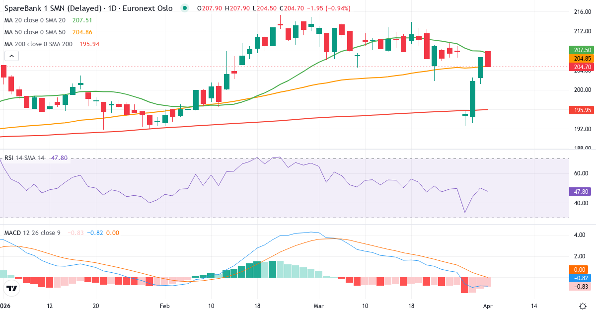 SpareBank 1 SMN er i en kortsiktig opptrend. Kursen på 206.65 Kr. ligger 5.2% over 20-dagers gjennomsnittet (196.35 Kr.). På mellomlang sikt er bildet positivt: kursen ligger 7.5% over 50-dagers gjennomsnittet (192.16 Kr.). Langsiktig ligger aksjen 12.7% over 200-dagers gjennomsnittet (183.34 Kr.), hvilket bekrefter en langsiktig opptrend.
