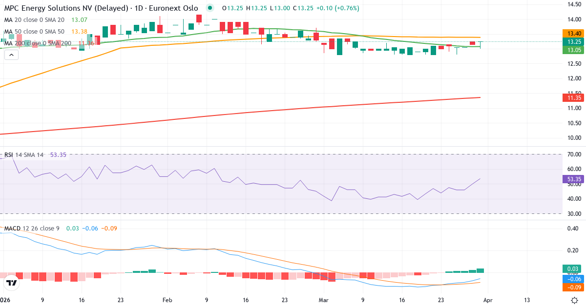 Golden Cross: 50-dagers gjennomsnittet (13.38) ligger over 200-dagers (11.37), hvilket er et klassisk bullish signal for MPC Energy Solutions N.V.