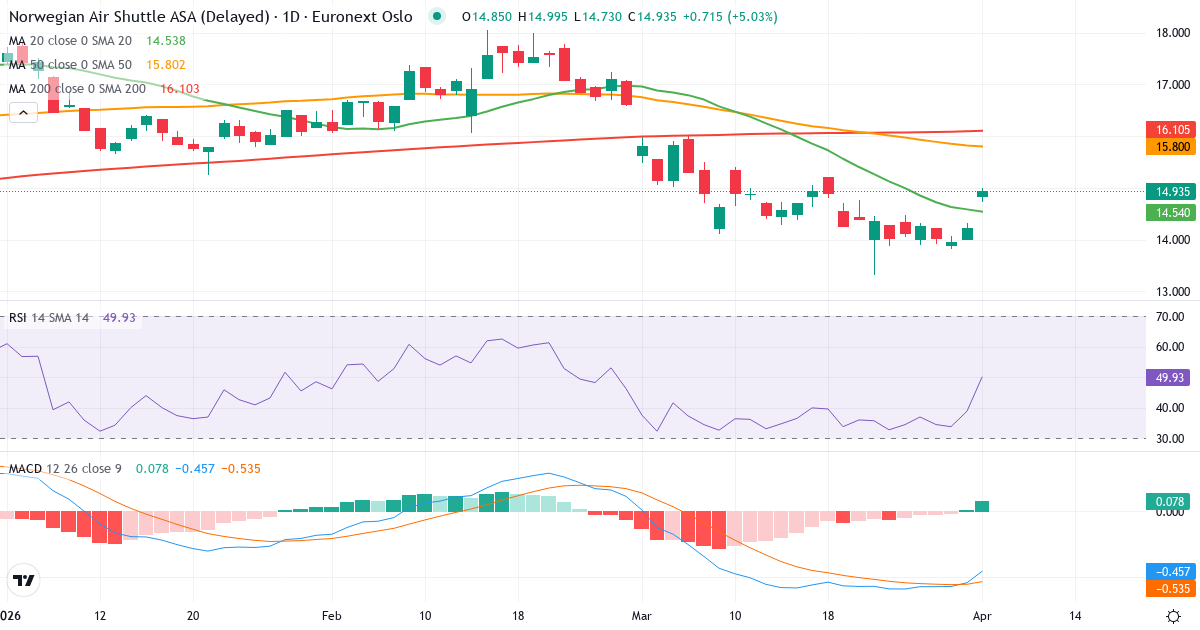 Death Cross: 50-dagers gjennomsnittet (15.82) ligger under 200-dagers (15.93), hvilket er et klassisk bearish signal for Norwegian Air Shuttle ASA.