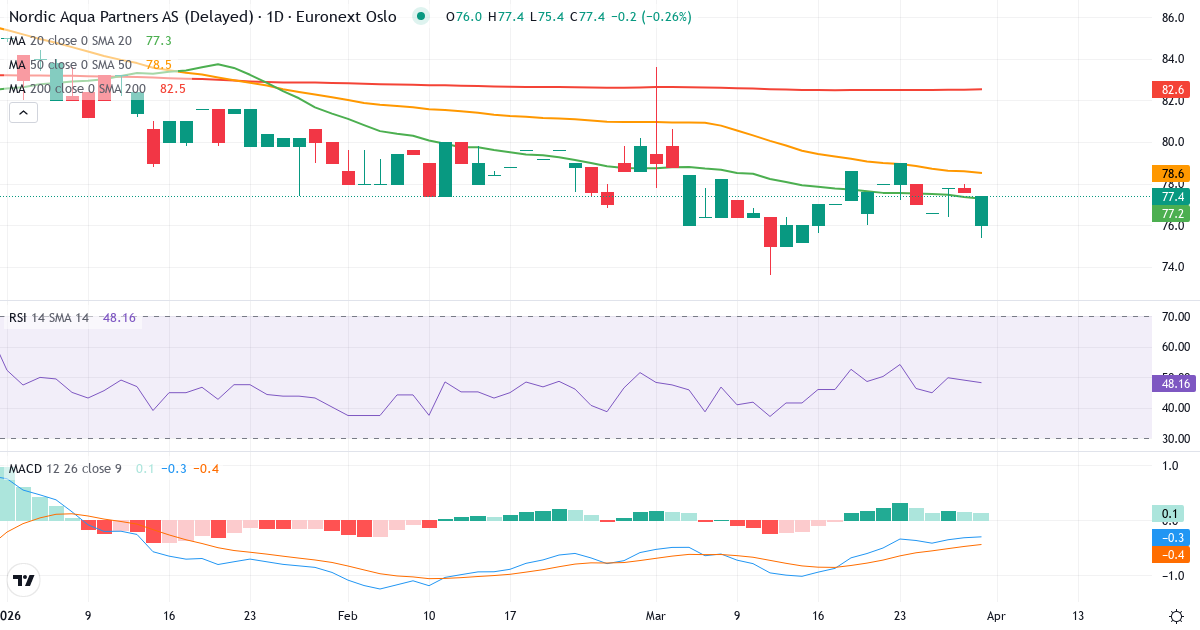 Death Cross: 50-dagers gjennomsnittet (78.42) ligger under 200-dagers (82.58), hvilket er et klassisk bearish signal for Nordic Aqua Partners A/S.