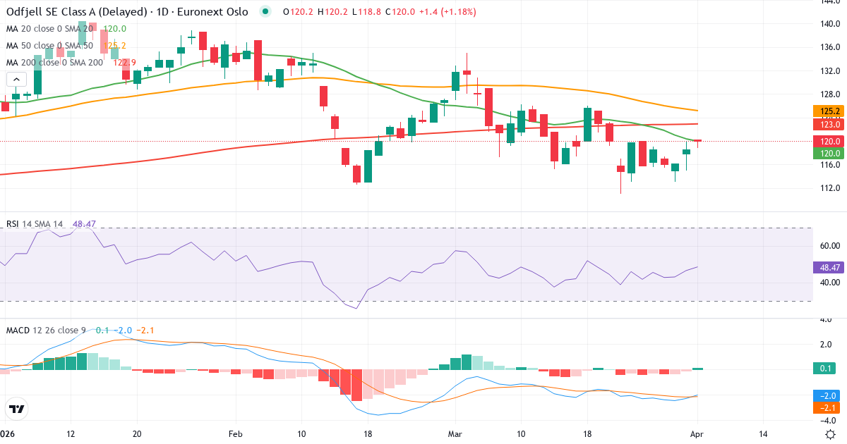 Odfjell SE er i en kortsiktig nedtrend. Kursen på 118.60 Kr. ligger 1.5% under 20-dagers gjennomsnittet (120.37 Kr.). På mellomlang sikt er bildet negativt: kursen ligger 4.0% under 50-dagers gjennomsnittet (123.58 Kr.). Langsiktig ligger aksjen 0.7% over 200-dagers gjennomsnittet (117.75 Kr.), hvilket bekrefter en langsiktig opptrend.