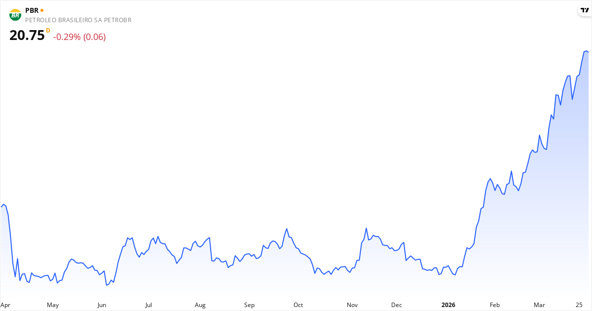 Fremtidsutsiktene for Petróleo Brasileiro S.A. - Petrobras basert på aktuelle data: analytikernes gjennomsnittlige kursmål er 14.74 $ (-26.1%); aksjen er i en opptrend (over SMA50 og SMA200); neste rapport publiseres den 11/05-2026, noe som kan påvirke kursen; P/E-tallet er 6.0 (lavt – mulig verdiaksje). Observer at aksjekurser påvirkes av mange faktorer, inkludert rapporter, makroøkonomi og markedssentiment. Historisk avkastning er ingen garanti for fremtidig avkastning.