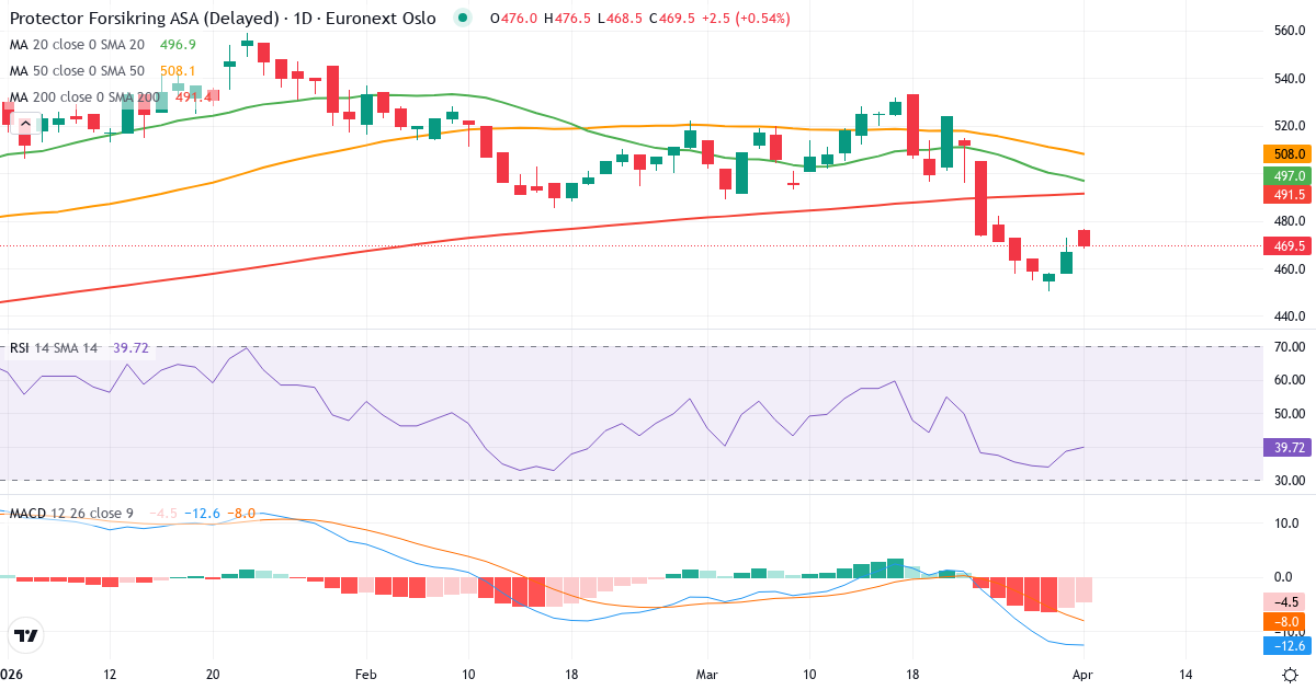 Det tekniske signalet for Protector Forsikring A er aktuelt NØYTRAL. Protector Forsikring A handles til 466.00 Kr. per 01/04-2026. Det samlede tekniske signal er: Selg. Den tekniske analysen viser følgende: MACD er negativ (bearish trend) på -12.196 med fallende momentum (signal: -6.561); RSI er på 38.6 (nøytral sone); aksjen er i en kortsiktig nedtrend (kurs under 20-dagers gjennomsnitt); analytikernes kursmål på 600.00 Kr. indikerer 28.8% oppside. Aksjen er i en overordnet nedtrend (under SMA50/SMA200). Kjøp i nedtrend frarådes generelt. Dette er en teknisk observasjon basert på aktuelle data, ikke en investeringsanbefaling.