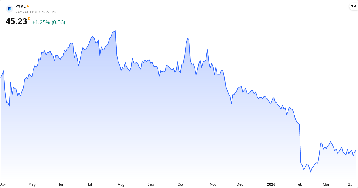 Fremtidsutsiktene for PayPal basert på aktuelle data: analytikernes gjennomsnittlige kursmål er 52.95 $ (+18.0%); aksjen er i en nedtrend (under SMA50 og SMA200); neste rapport publiseres den 05/05-2026, noe som kan påvirke kursen; P/E-tallet er 8.3 (lavt – mulig verdiaksje). Observer at aksjekurser påvirkes av mange faktorer, inkludert rapporter, makroøkonomi og markedssentiment. Historisk avkastning er ingen garanti for fremtidig avkastning.
