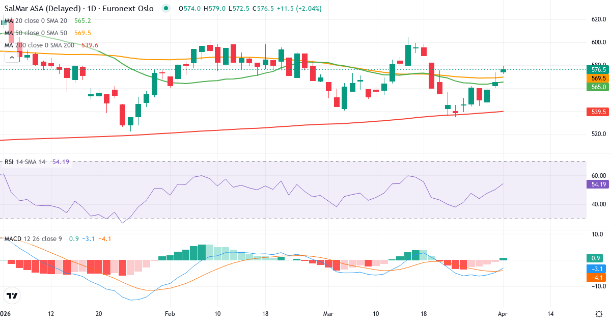 Golden Cross: 50-dagers gjennomsnittet (568.93) ligger over 200-dagers (538.86), hvilket er et klassisk bullish signal for SalMar ASA.