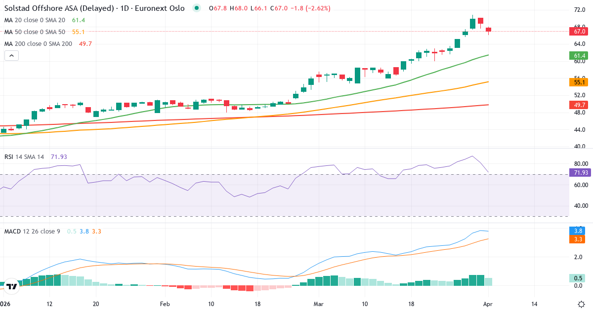 Solstad Offshore ASA har en RSI på 81.6, hvilket plasserer aksjen i overkjøpt territorium (over 70). Selv om aksjen er overkjøpt, er den overordnede trenden positiv. En kortvarig korrigering er mulig, men trenden støtter fortsatt kursen.