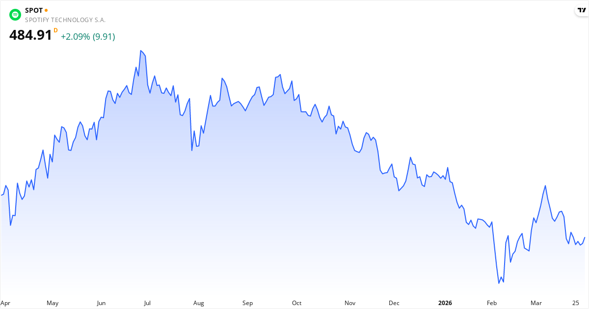 Spotify Technology handles til en P/E på 39.2, noe som er over markedsgjennomsnittet. Forward P/E er 32.1 (18% lavere), noe som indikerer at markedet forventer stigende inntjening. P/S-forholdet er 5.7 (høy — markedet betaler en premium for omsetningen). P/B er 10.2. PEG-forholdet er 1.99.