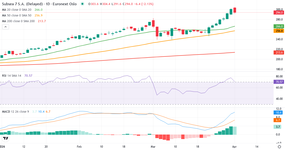 Golden Cross: 50-dagers gjennomsnittet (255.50) ligger over 200-dagers (209.88), hvilket er et klassisk bullish signal for Subsea 7 S.A.