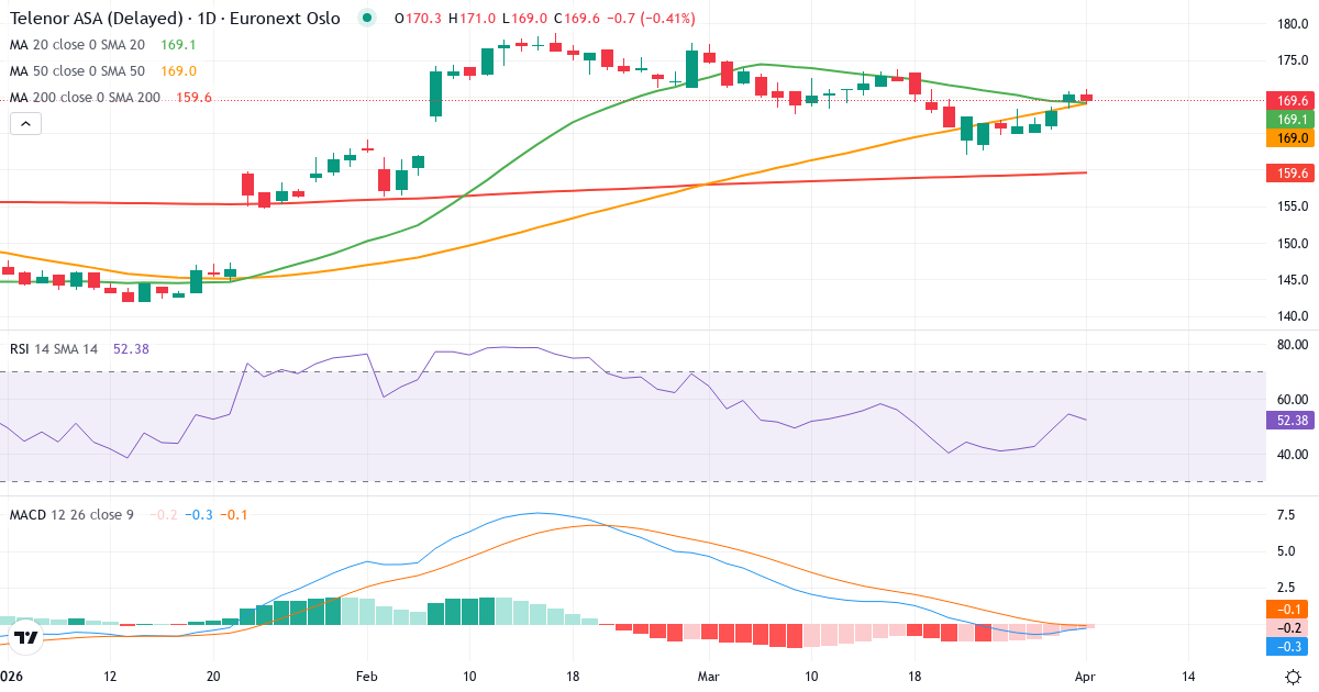Telenor ASA er i en kortsiktig opptrend. Kursen på 170.30 Kr. ligger 0.6% over 20-dagers gjennomsnittet (169.32 Kr.). På mellomlang sikt er bildet positivt: kursen ligger 1.0% over 50-dagers gjennomsnittet (168.55 Kr.). Langsiktig ligger aksjen 8.1% over 200-dagers gjennomsnittet (157.61 Kr.), hvilket bekrefter en langsiktig opptrend.