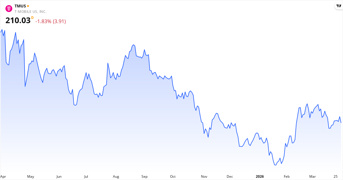 T-Mobile US handles til en P/E på 22.0, noe som er nær markedsgjennomsnittet. Forward P/E er 19.4 (12% lavere), noe som indikerer at markedet forventer stigende inntjening. P/S-forholdet er 2.7. P/B er 3.9. PEG-forholdet er 0.80 — under 1.0 tyder på at aksjen er billig i forhold til vekstraten.