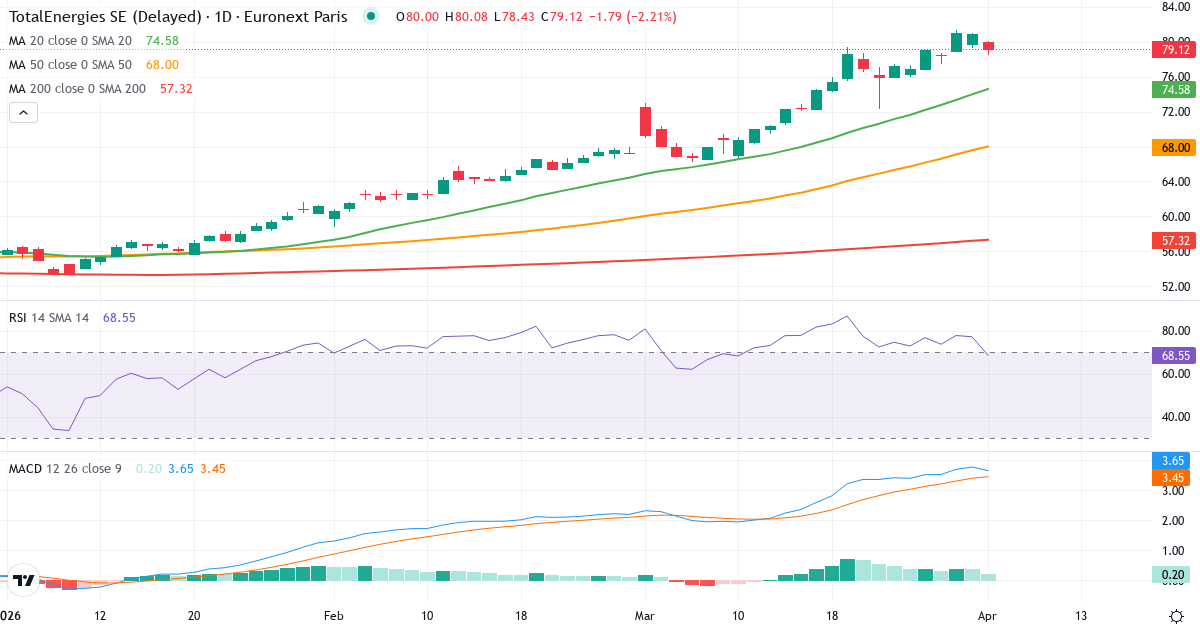 TotalEnergies's neste rapport publiseres den 29. april 2026. Denne rapporten dekker første kvartal (Q1) og ble avsluttet den 31. mars 2026.Teknisk analyse av TotalEnergies 2026 – Signal: Sterkt Kjøp