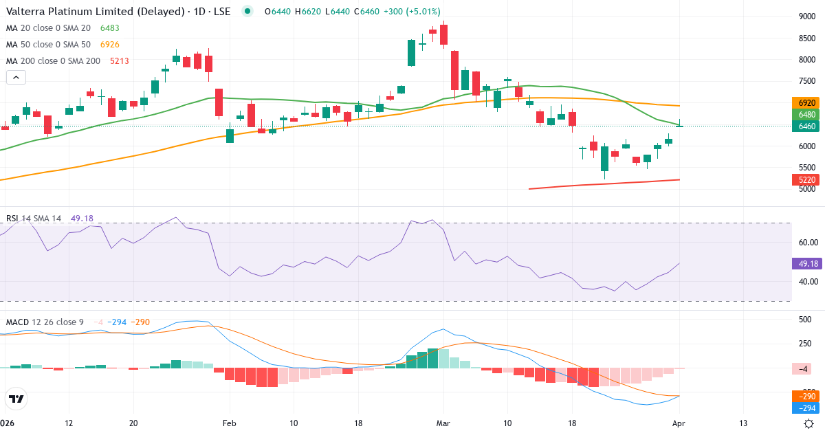 Golden Cross: 50-dagers gjennomsnittet (6,725.92) ligger over 200-dagers (5,026.54), hvilket er et klassisk bullish signal for VALTERRA PLATINUM LTD.