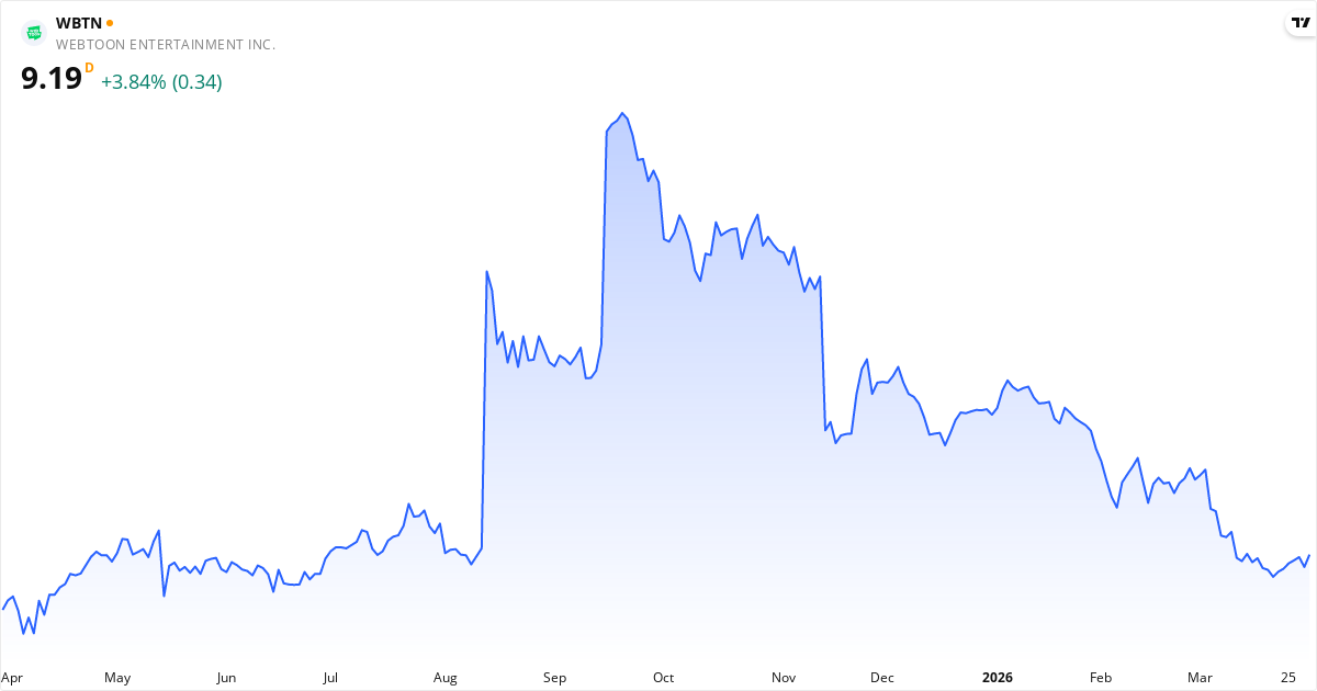 WEBTOON Entertainment aksjekurs – Kursutvikling 2026. Oppdatert 01. Apr 2026.