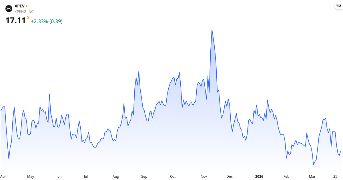 Den aktuelle kursen er $17.66, hvilket plasserer XPeng i kategorien undervurdert. Aksjen bedømmes som undervurdert, om kursen er under $22.482, og som overvurdert, om kursen overstiger $27.478.
