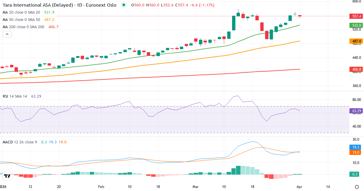 Yara International ASA er i en kortsiktig opptrend. Kursen på 564.00 Kr. ligger 6.8% over 20-dagers gjennomsnittet (528.28 Kr.). På mellomlang sikt er bildet positivt: kursen ligger 16.5% over 50-dagers gjennomsnittet (484.31 Kr.). Langsiktig ligger aksjen 38.9% over 200-dagers gjennomsnittet (405.95 Kr.), hvilket bekrefter en langsiktig opptrend.