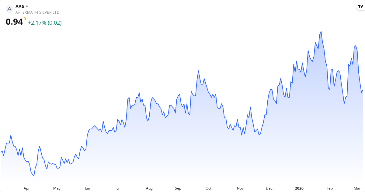 Golden Cross: 50-dagars genomsnittet (1.08) ligger över 200-dagars (0.87), vilket är en klassisk bullish signal for Aftermath Silver Ltd.