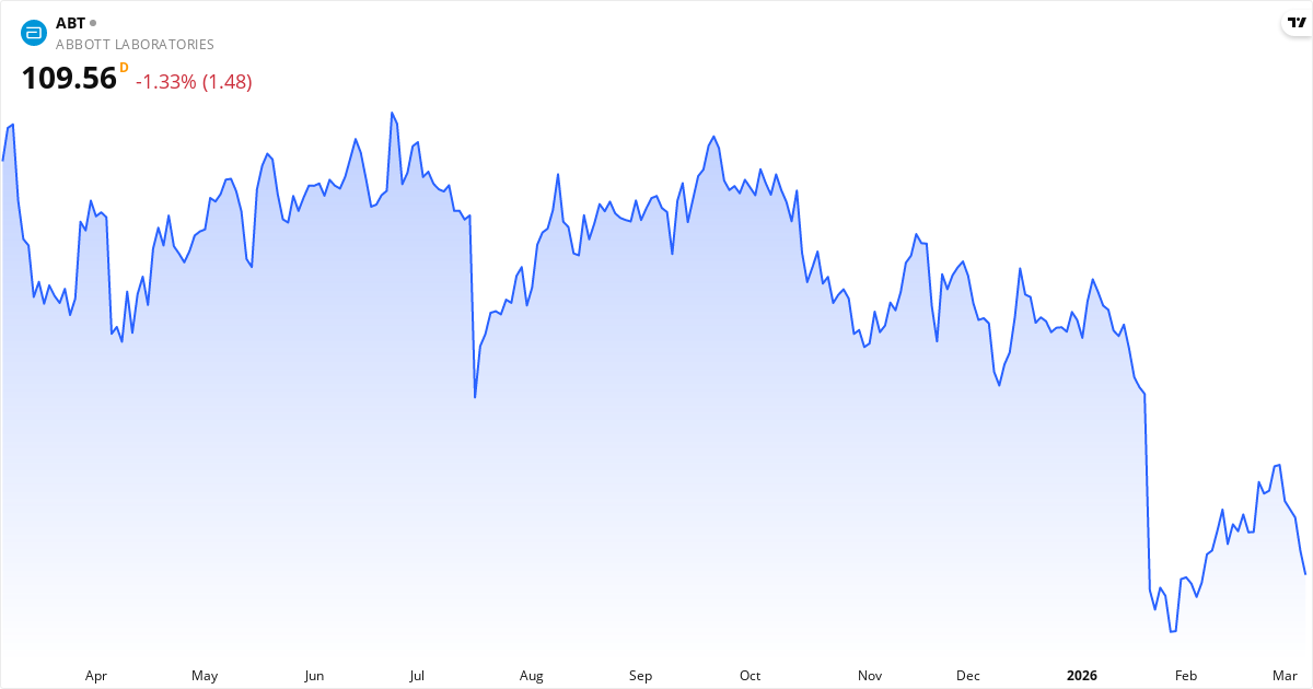Abbott Laboratories publicerar nästa rapport den 15. april 2026. Aktien handlas för närvarande till 109.56 $. Med ett P/E-tal på 29.9 kommer marknaden hålla utkik efter om intjäningen lever upp till förväntningarna.