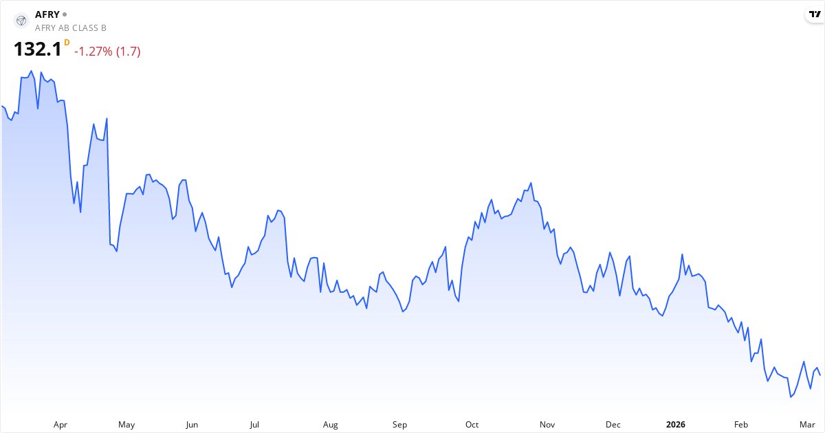 Den aktuella kursen är Kr.132.1, vilket placerar Afry i kategorin undervärderad. Aktien bedöms som undervärderad, om kursen är under Kr.157.5, och som övervärderad, om kursen överstiger Kr.192.5.