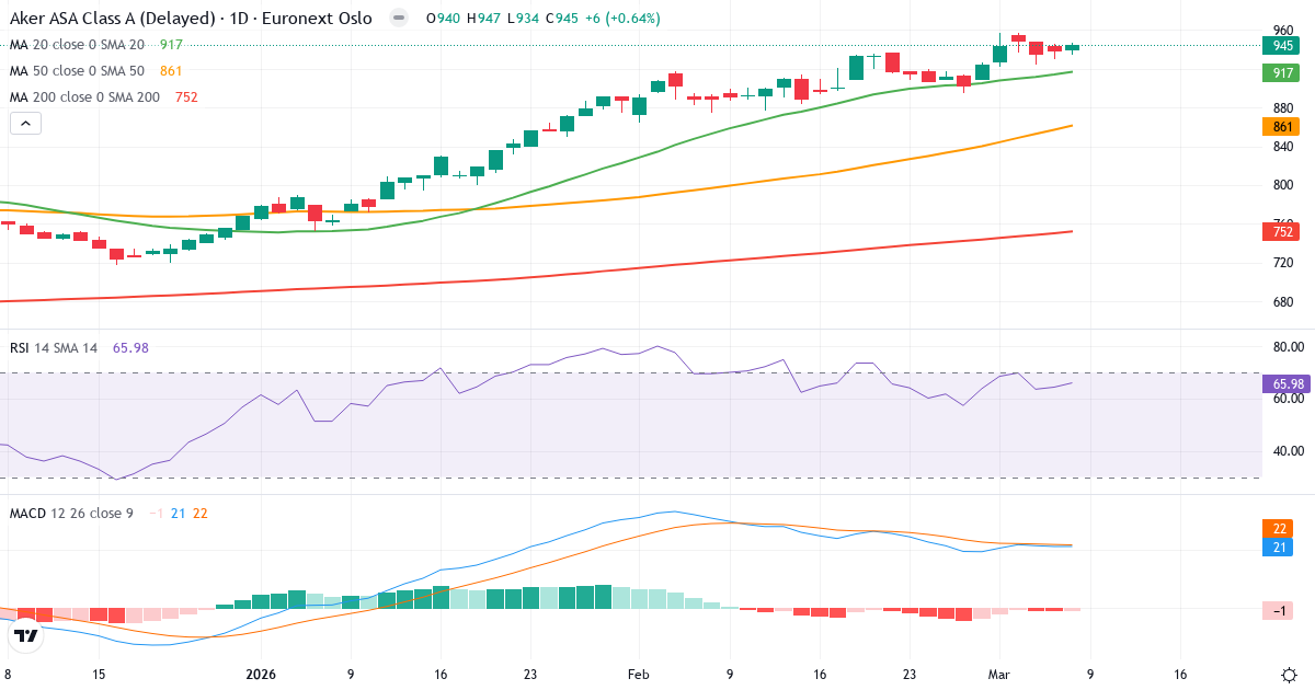 Aker ASA har ett RSI på 66.0. Aktien visar positivt momentum i den övre delen av neutral zone. I kombination med den positive trend stödjer detta den bullish bilden.