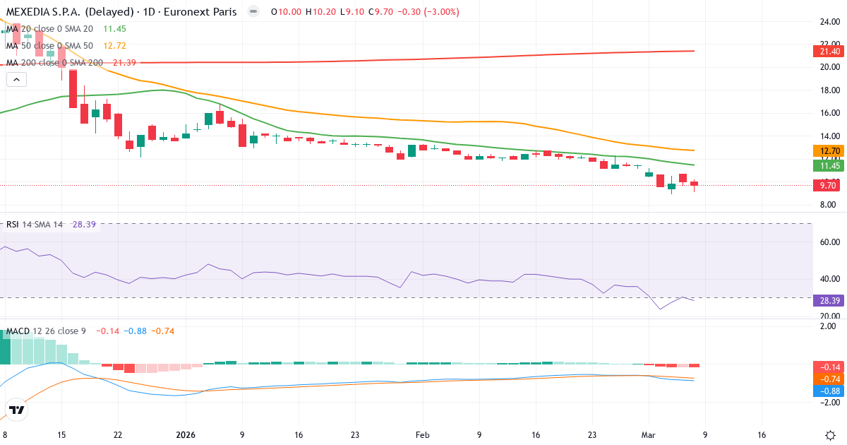 Death Cross: 50-dagars genomsnittet (12.72) ligger under 200-dagars (24.08), vilket är en klassisk bearish signal for Airtime Partecipazioni SpA.