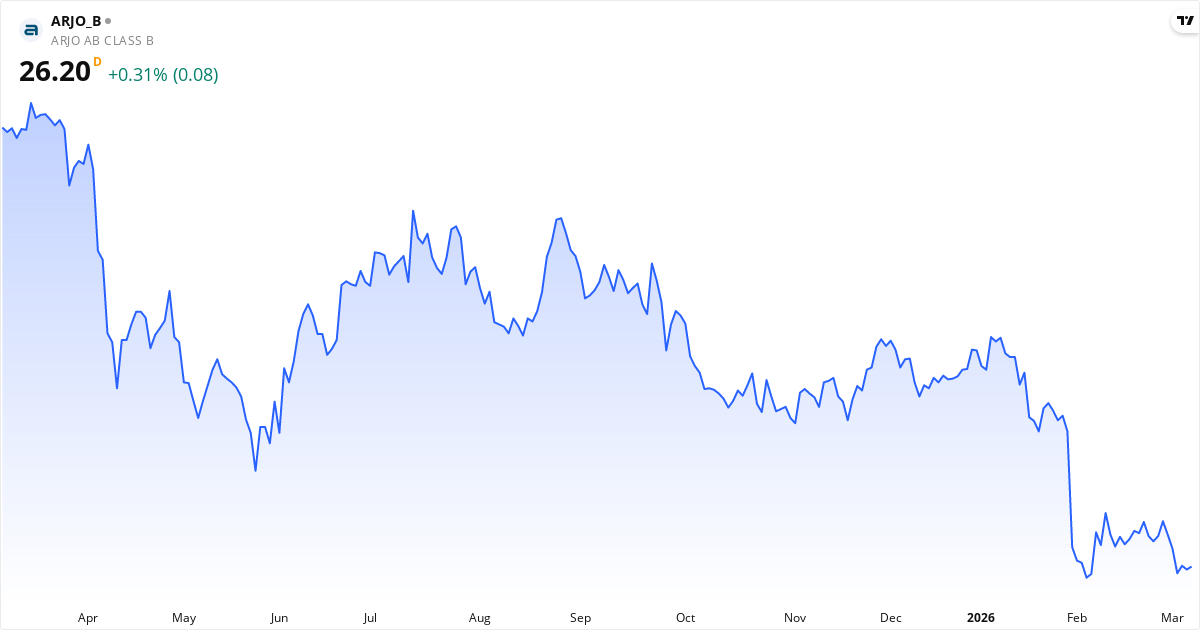 Den aktuella kursen är Kr.26.2, vilket placerar Arjo i kategorin undervärderad. Aktien bedöms som undervärderad, om kursen är under Kr.27.225, och som övervärderad, om kursen överstiger Kr.33.275.
