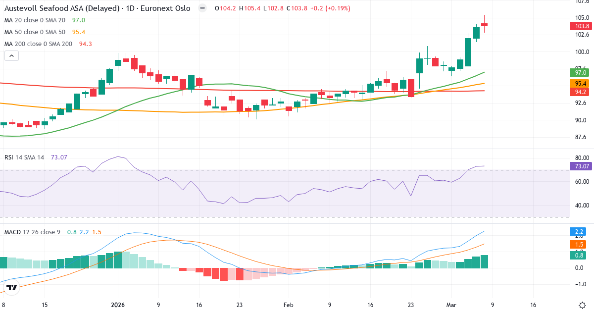 Golden Cross: 50-dagars genomsnittet (95.37) ligger över 200-dagars (94.12), vilket är en klassisk bullish signal for Austevoll Seafood ASA.