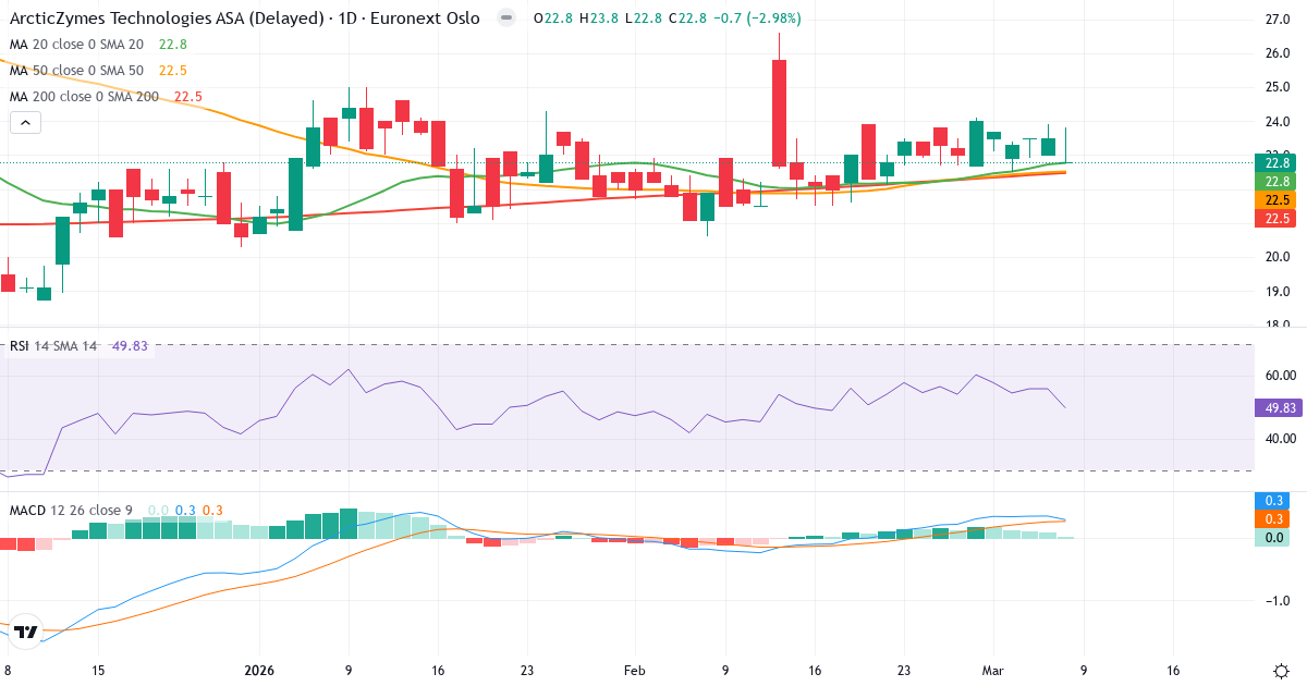 Golden Cross: 50-dagars genomsnittet (22.52) ligger över 200-dagars (22.47), vilket är en klassisk bullish signal for ArcticZymes Technologies ASA.