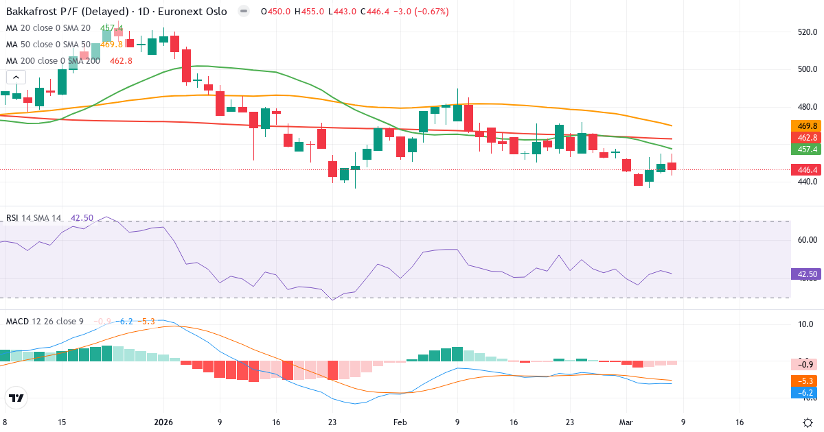 Golden Cross: 50-dagars genomsnittet (469.84) ligger över 200-dagars (462.79), vilket är en klassisk bullish signal for P/F Bakkafrost.