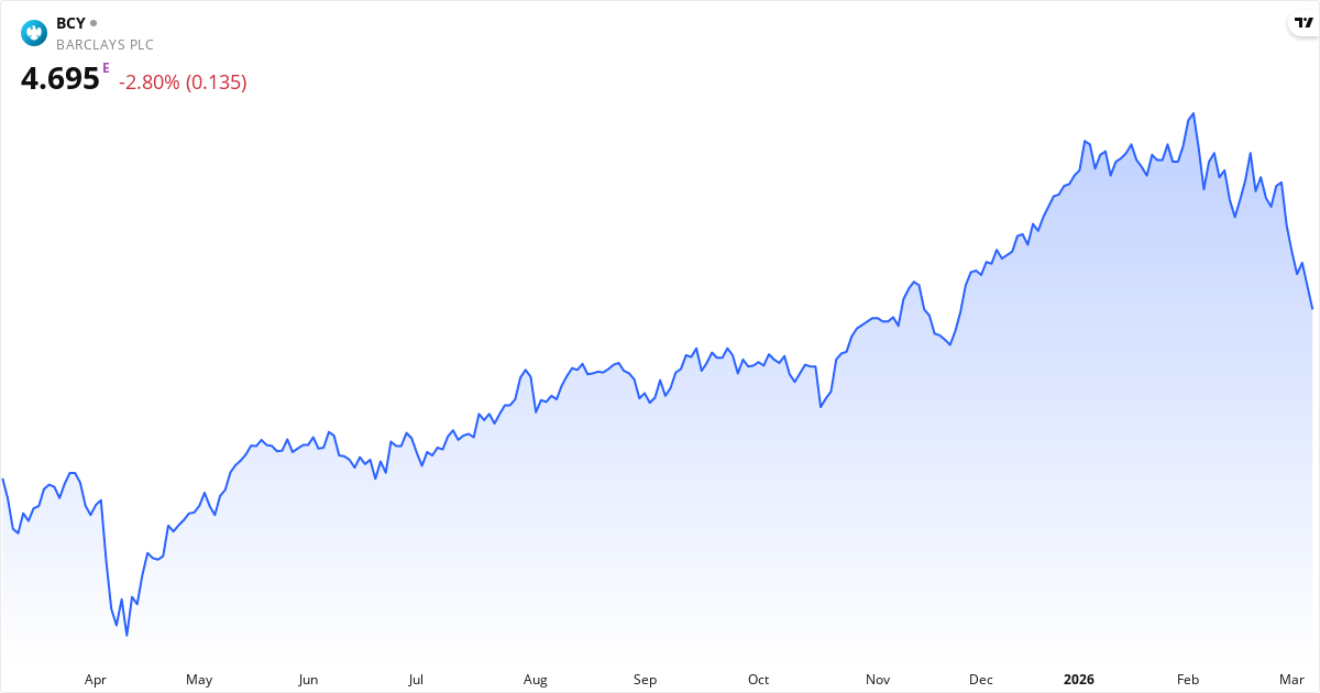 Barclays har en vinstmarginal på 26.7% (fremragende) och en rörelsemarginal på 31.7%. ROE er 9.6%. ROA er 0.5%. Den senaste kvartalsintjäningen växte med 29.0% år-över-år — stark tillväxt.