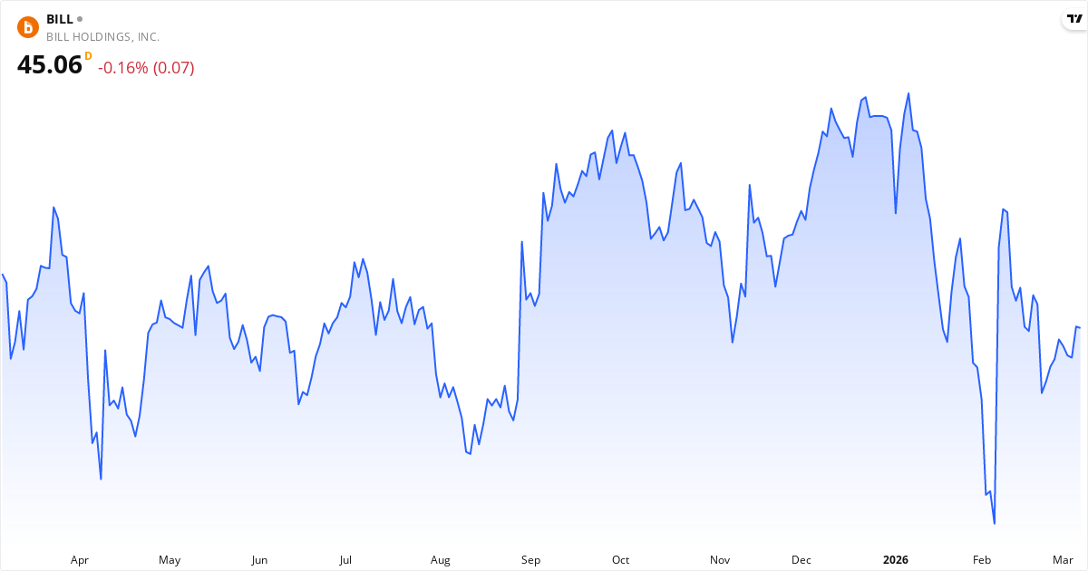 Bill.com publicerar nästa rapport den 30. april 2026. Aktien handlas för närvarande till 45.06 $.