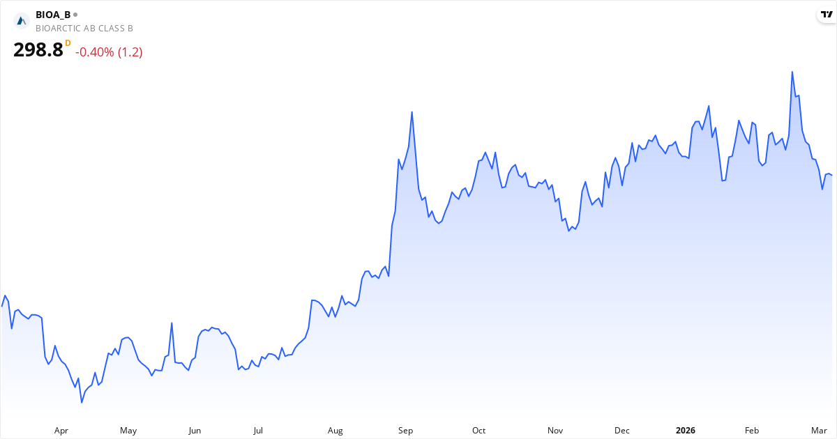 BioArctic är ett svenskt bioteknikföretag som forskar i och utvecklar biologisk medicin för personer med neurologiska sjukdomar. De fokuserar särskilt på sjukdomar som Alzheimers och Parkinsons. Just nu är BioArctic i fas III-studier med sitt medel BAN2401, som ska behandla Alzheimers genom att rikta in sig på de skadliga proteinerna i hjärnan. De arbetar också med ABBV-0805, en antikroppsbehandling mot Parkinsons, och testar SC0806 för ryggmärgsskador. Dessutom utvecklar BioArctic teknologier som hjälper medicin att passera blod-hjärnbarriären. De har också tidiga studier av BAN2401 Back-up, som är inriktad på tidig Alzheimers. Företaget grundades 2003. Läs om företagetNyckeltal for BioArctic