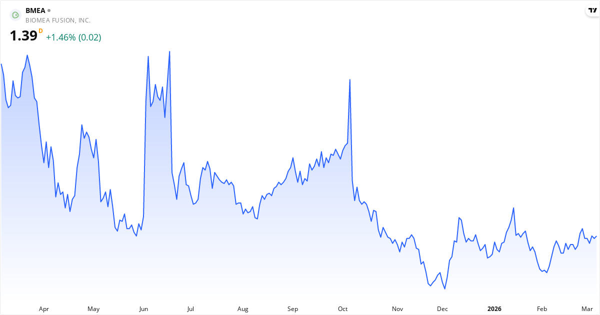 Death Cross: 50-dagars genomsnittet (1.31) ligger under 200-dagars (1.61), vilket är en klassisk bearish signal for Biomea Fusion, Inc.