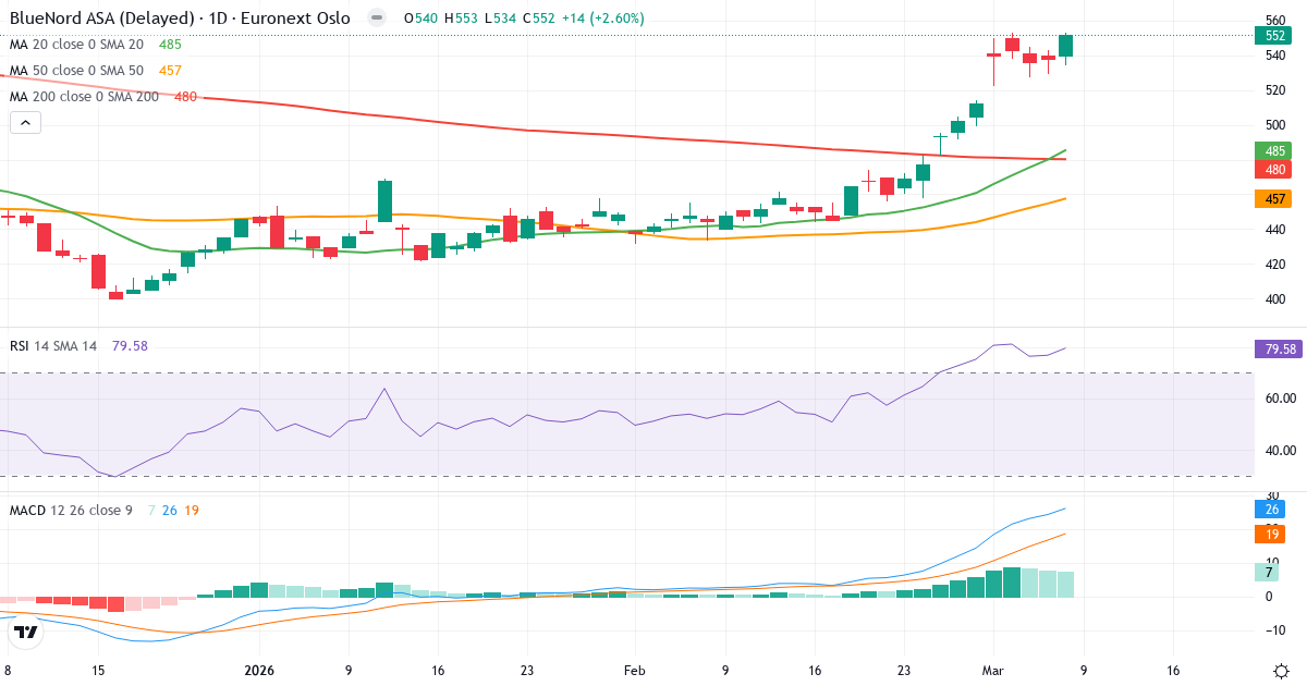 BlueNord ASA är i en kortsiktig upptrend. Kursen på 552.00 Kr. ligger 13.7% över 20-dagars genomsnittet (485.30 Kr.). På medellång sikt er bilden positiv: kursen ligger 20.7% över 50-dagars genomsnittet (457.46 Kr.). Långsiktigt ligger aktien 23.7% över 200-dagars genomsnittet (446.35 Kr.), vilket bekräftar en långsiktigt upptrend.