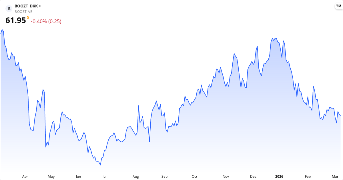 Boozt publicerar nästa rapport den 24. april 2026. Aktien handlas för närvarande till 61.95 Kr.. Med ett P/E-tal på 19.9 kommer marknaden hålla utkik efter om intjäningen lever upp till förväntningarna.