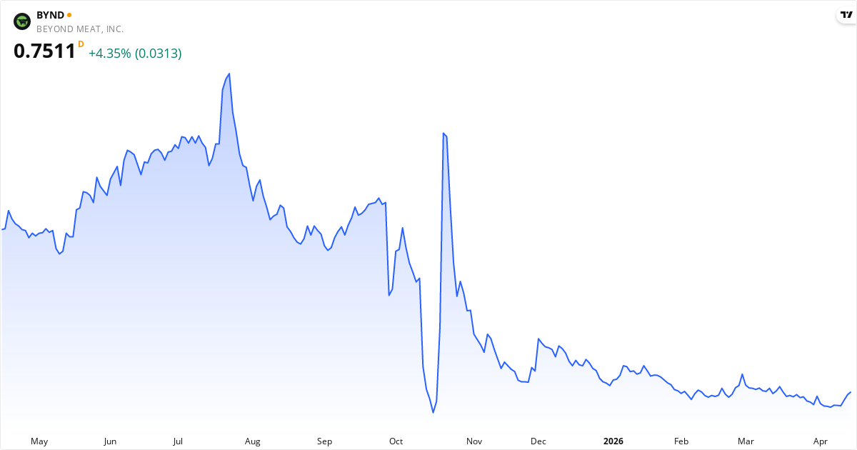 Beyond Meat publicerar nästa rapport den 13. maj 2026. Aktien handlas för närvarande till 0.80 $.