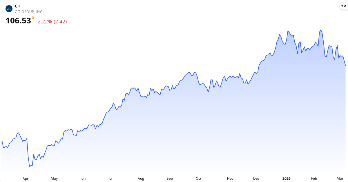 Citi publicerar nästa rapport den 14. april 2026. Aktien handlas för närvarande till 106.53 $. Med ett P/E-tal på 15.6 kommer marknaden hålla utkik efter om intjäningen lever upp till förväntningarna.