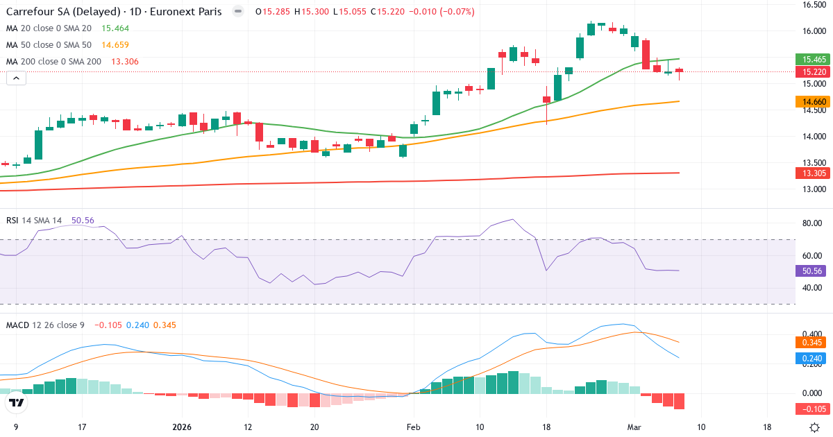 Carrefour SA har ett RSI på 50.6, mitt i neutral zon. Det finns varken tydligt köp- eller säljtryck.