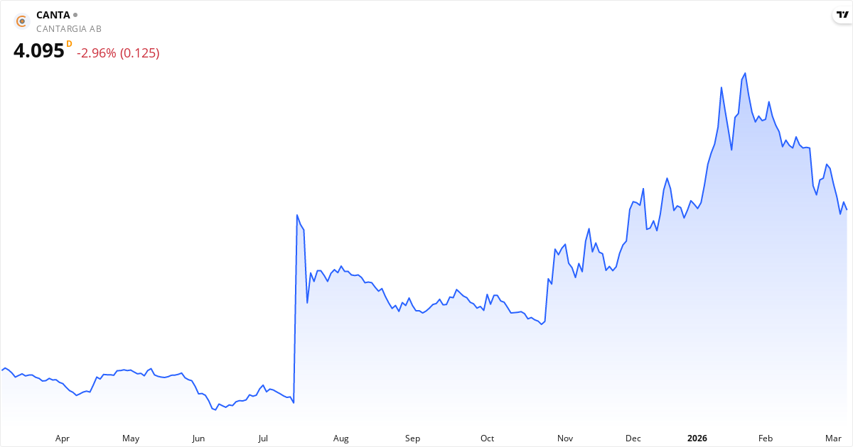 Den aktuella kursen är Kr.4.095, vilket placerar Cantargia i kategorin undervärderad. Aktien bedöms som undervärderad, om kursen är under Kr.7.803, och som övervärderad, om kursen överstiger Kr.9.537.