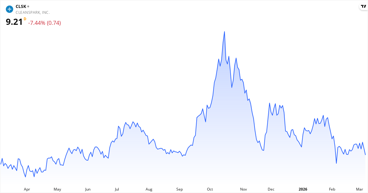 CleanSpark aktiekurs – Kursutveckling 2026. Uppdaterad 08. Mar 2026.