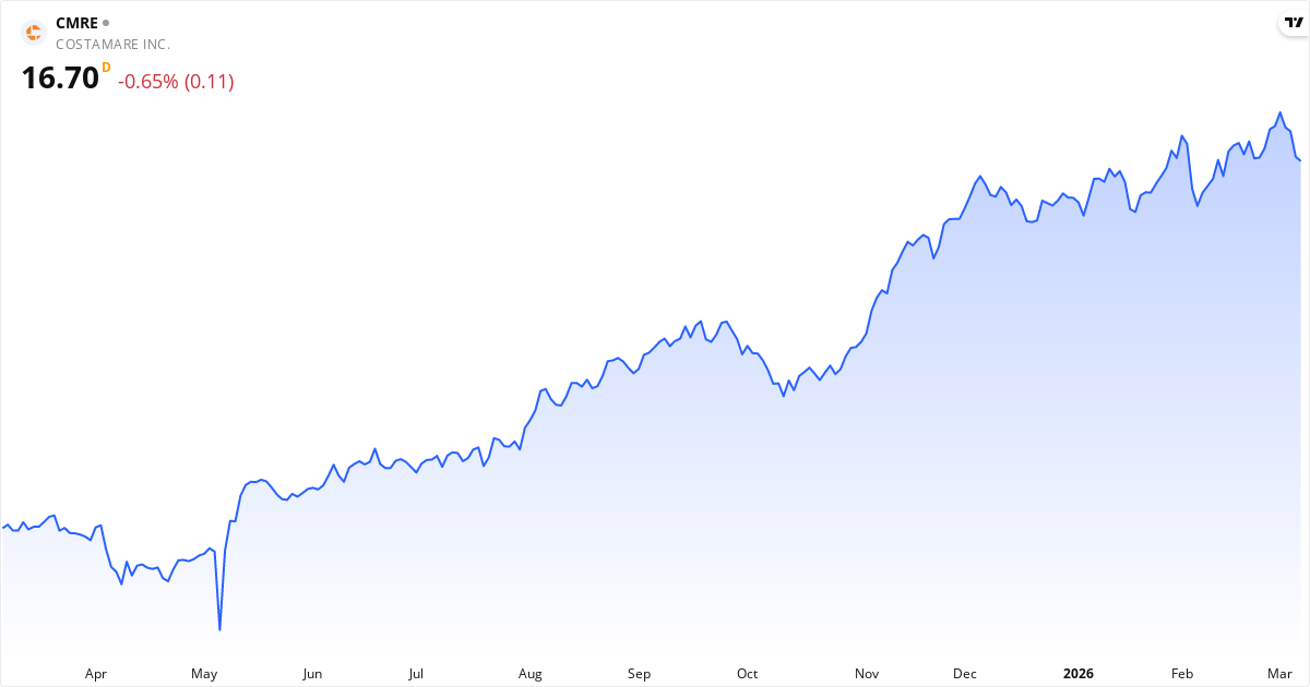 Costamare Inc. driver en ganska stor verksamhet med att äga och hyra ut containerfartyg till rederier över hela världen. De tjänar alltså pengar på att låta andra segla med deras fartyg. Costamare har en enorm flotta som består av 76 containerfartyg och 45 torrlastfartyg. Detta gör dem till en viktig aktör inom global sjötransport, då de täcker både containerfrakt och torrlast. Företaget grundades redan 1974 och har sitt huvudkontor i Monaco. Costamare Inc. är intressant för investerare som vill ha exponering mot sjöfart, särskilt eftersom de har en så mångsidig flotta. Läs om företagetNyckeltal for Costamare
