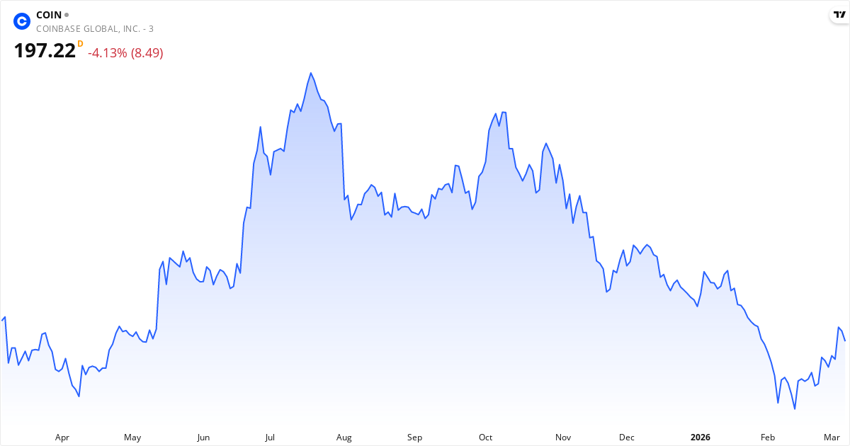 Coinbase Global aktiekurs – Kursutveckling 2026. Uppdaterad 08. Mar 2026.