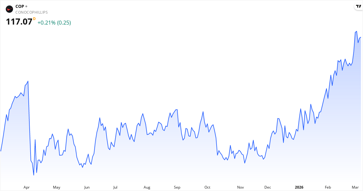 Kursutveckling for ConocoPhillips (COP.US) – aktiekurs på 117.07 $, marts 2026