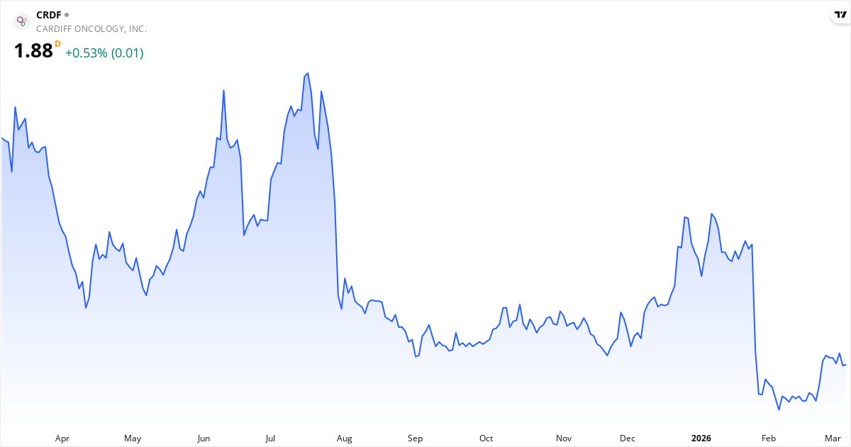 Cardiff Oncology aktiekurs – Kursutveckling 2026. Uppdaterad 08. Mar 2026.