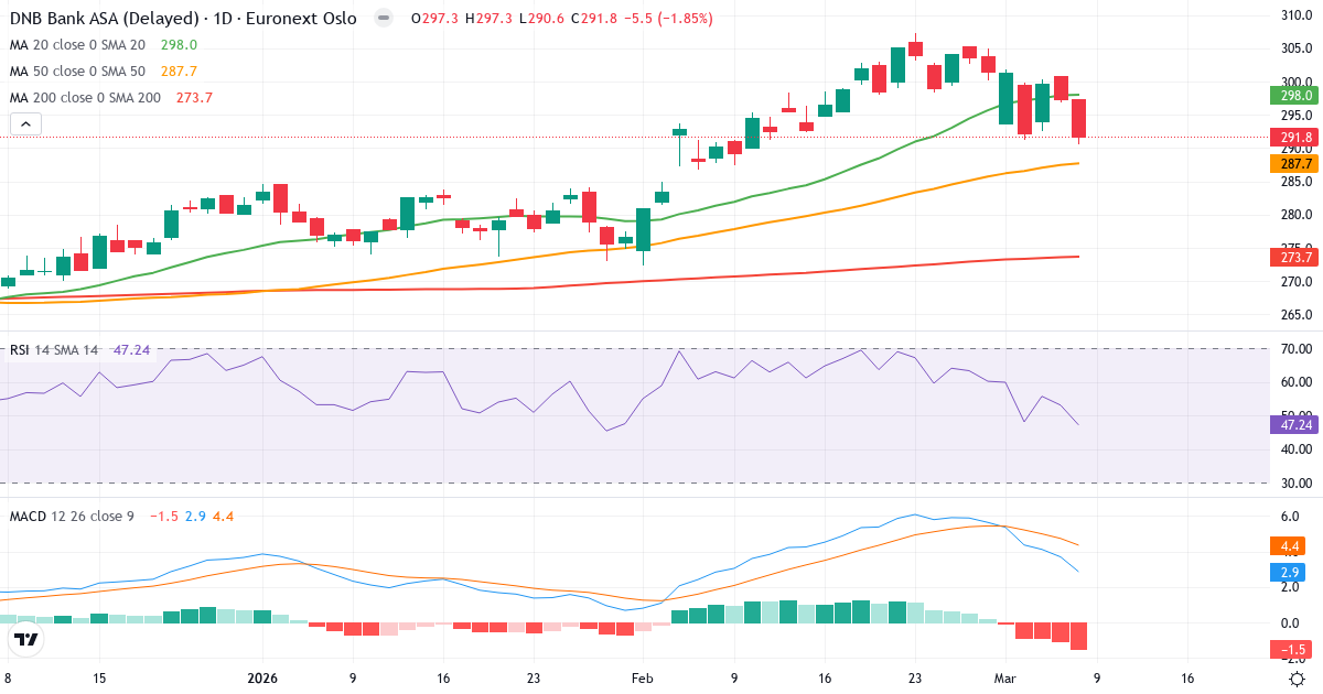DNB A teknisk analys – Candlestick-diagram med RSI och MACD. Uppdaterad 08. Mar 2026.