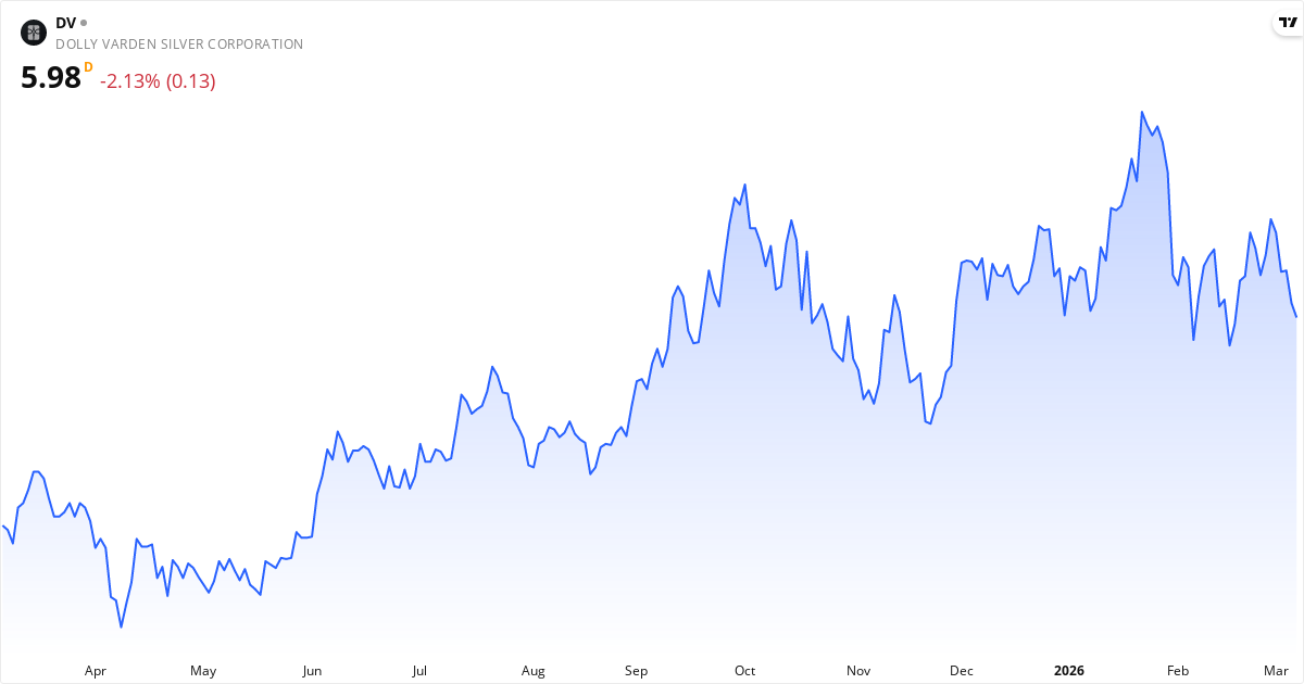 Den aktuella kursen är CAD5.98, vilket placerar Dolly Varden Silver i kategorin undervärderad. Aktien bedöms som undervärderad, om kursen är under CAD12.564, och som övervärderad, om kursen överstiger CAD15.356.