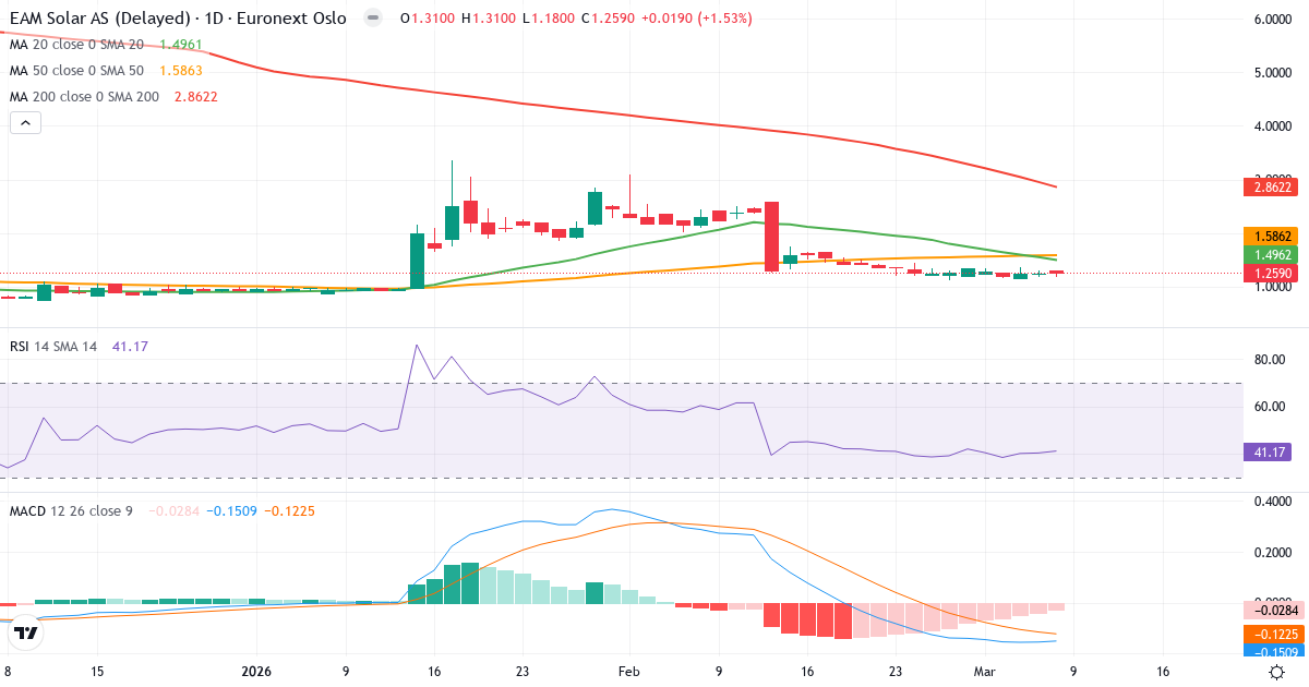 EAM Solar ASA är i en kortsiktig nedtrend. Kursen på 1.26 Kr. ligger 15.8% under 20-dagars genomsnittet (1.50 Kr.). På medellång sikt er bilden negativ: kursen ligger 20.6% under 50-dagars genomsnittet (1.59 Kr.). Långsiktigt ligger aktien 64.3% under 200-dagars genomsnittet (3.53 Kr.), vilket indikerar en långsiktigt nedtrend.