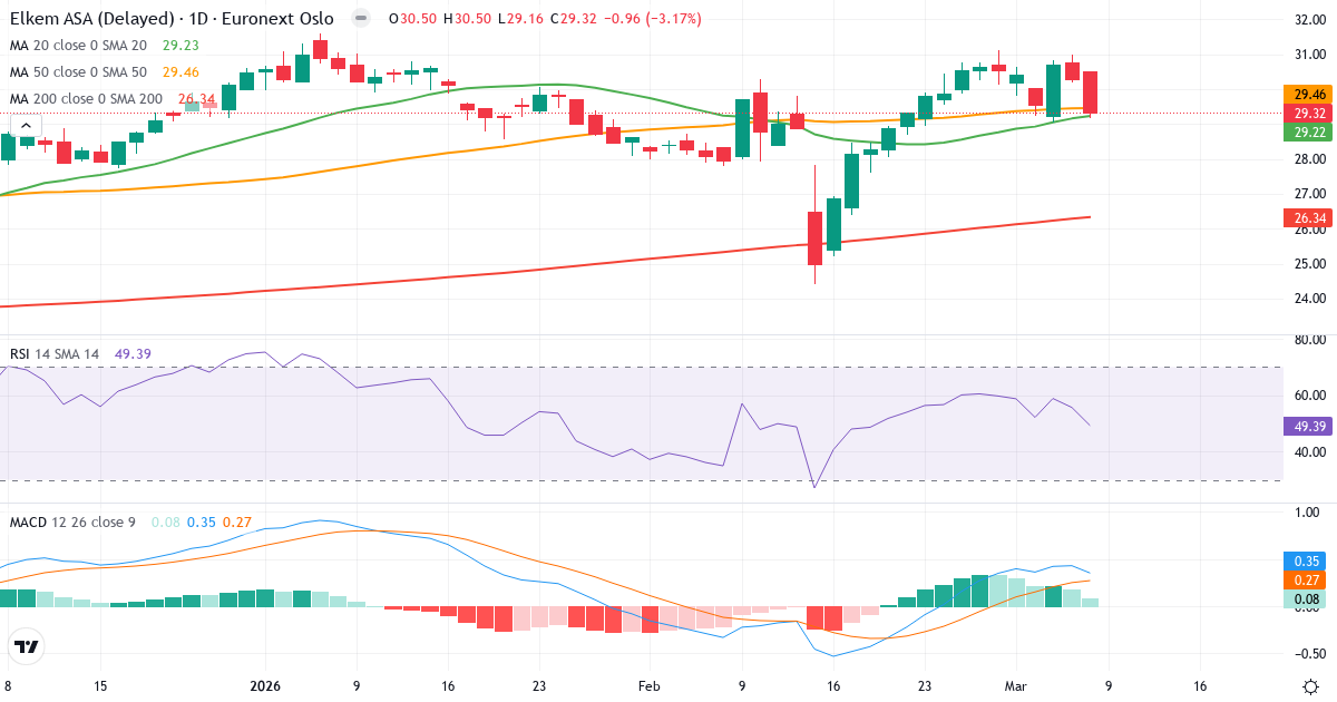 Golden Cross: 50-dagars genomsnittet (29.46) ligger över 200-dagars (26.34), vilket är en klassisk bullish signal for Elkem ASA.