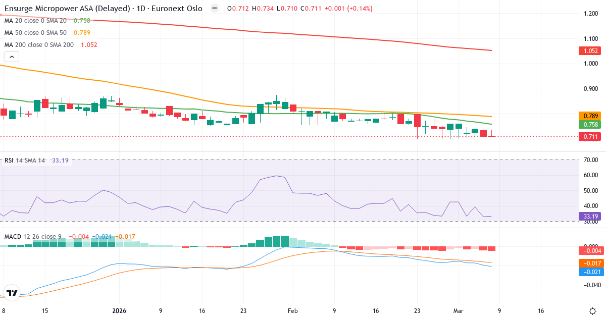Death Cross: 50-dagars genomsnittet (0.79) ligger under 200-dagars (1.05), vilket är en klassisk bearish signal for Ensurge Micropower ASA.